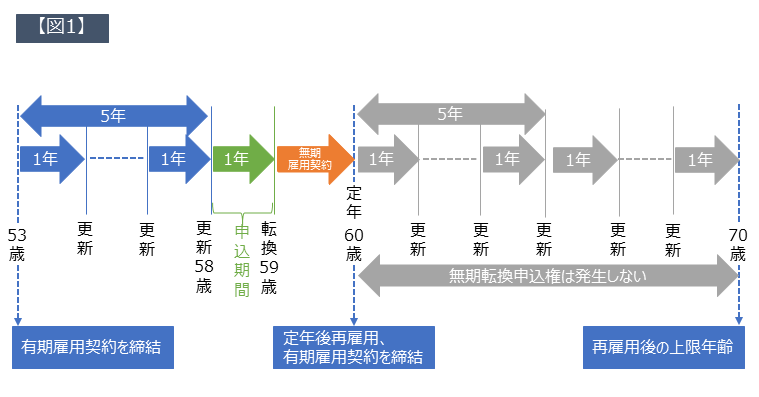 この場合には58歳の時点で無期転換申込権が発生し、すぐに権利行使すれば59歳から無期雇用契約に転換します。ただし、1年後には60歳の定年に達し、無期雇用契約が終了することになります。その後の70歳までの有期雇用契約社員としての継続雇用については、無期転換ルールの特例②が適用され、無期転換申込権は発生しないことになります(図1参照)。