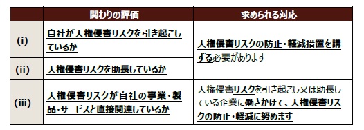 まず、①の「自社が負の影響を引き起こしている場合」または②「助長してしまっている場合」には、企業は原因となっている活動を直ちに停止することが求められます。あわせて、原因となっている活動の実施に至った経緯や影響等を確認・分析し、同様の活動が再発しないよう、対応する必要があります。