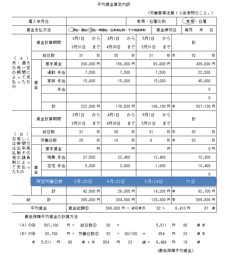 - 上記の通りですが、分かり難いので具体的な数字で見てみます。まずは、以下の「平均賃金算定内訳」をご確認ください。